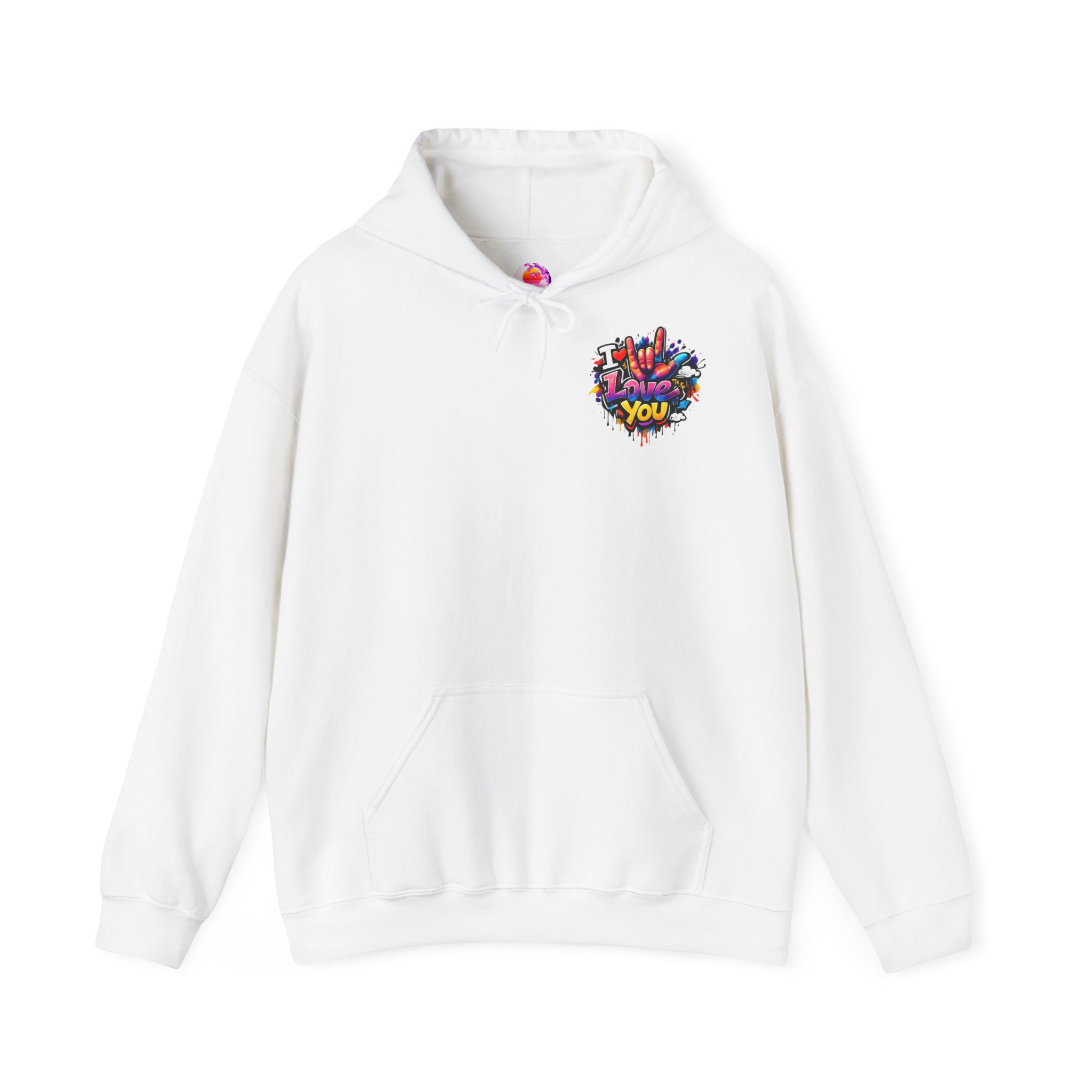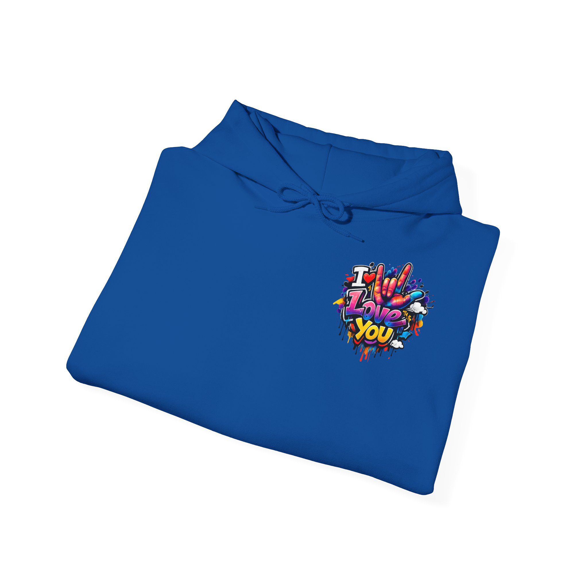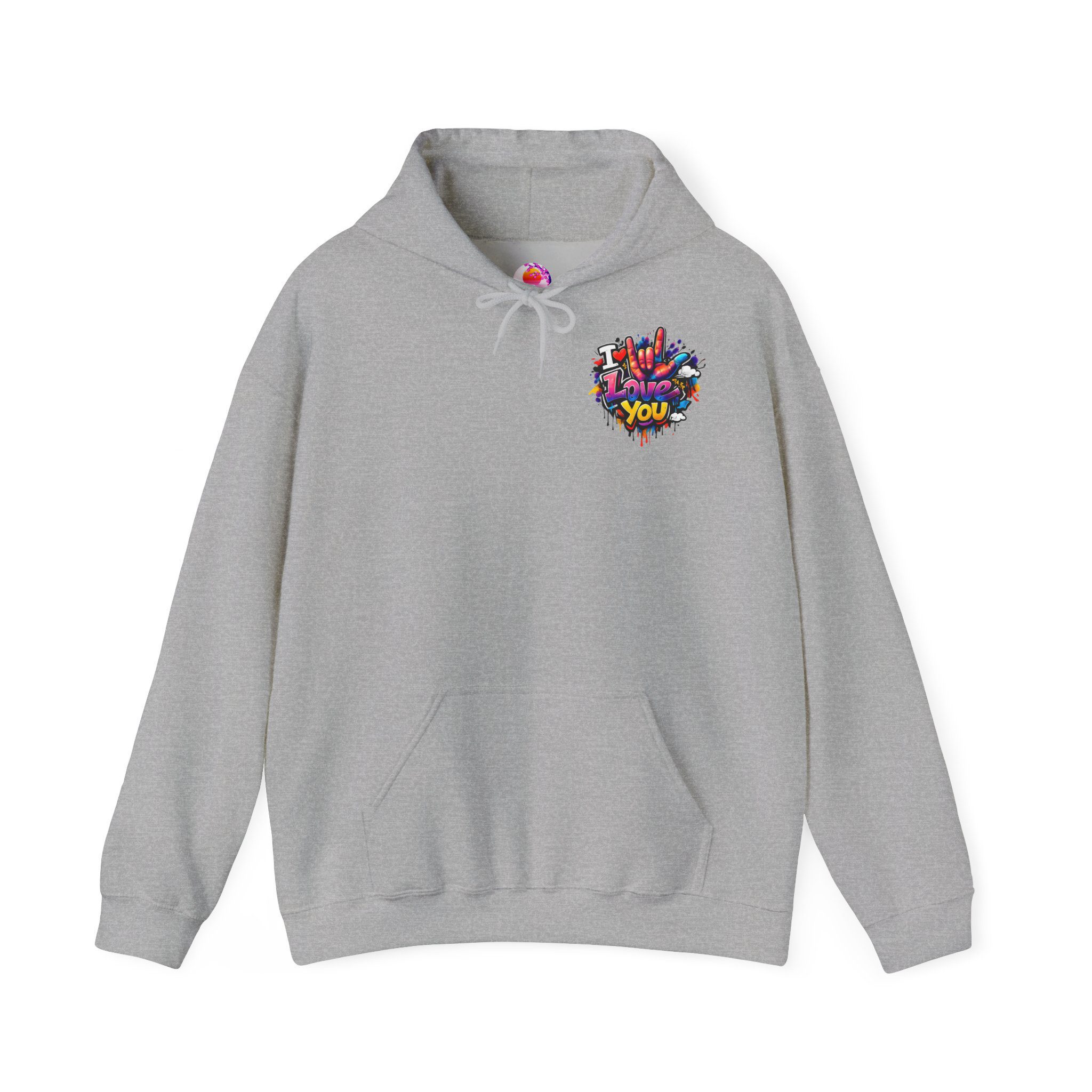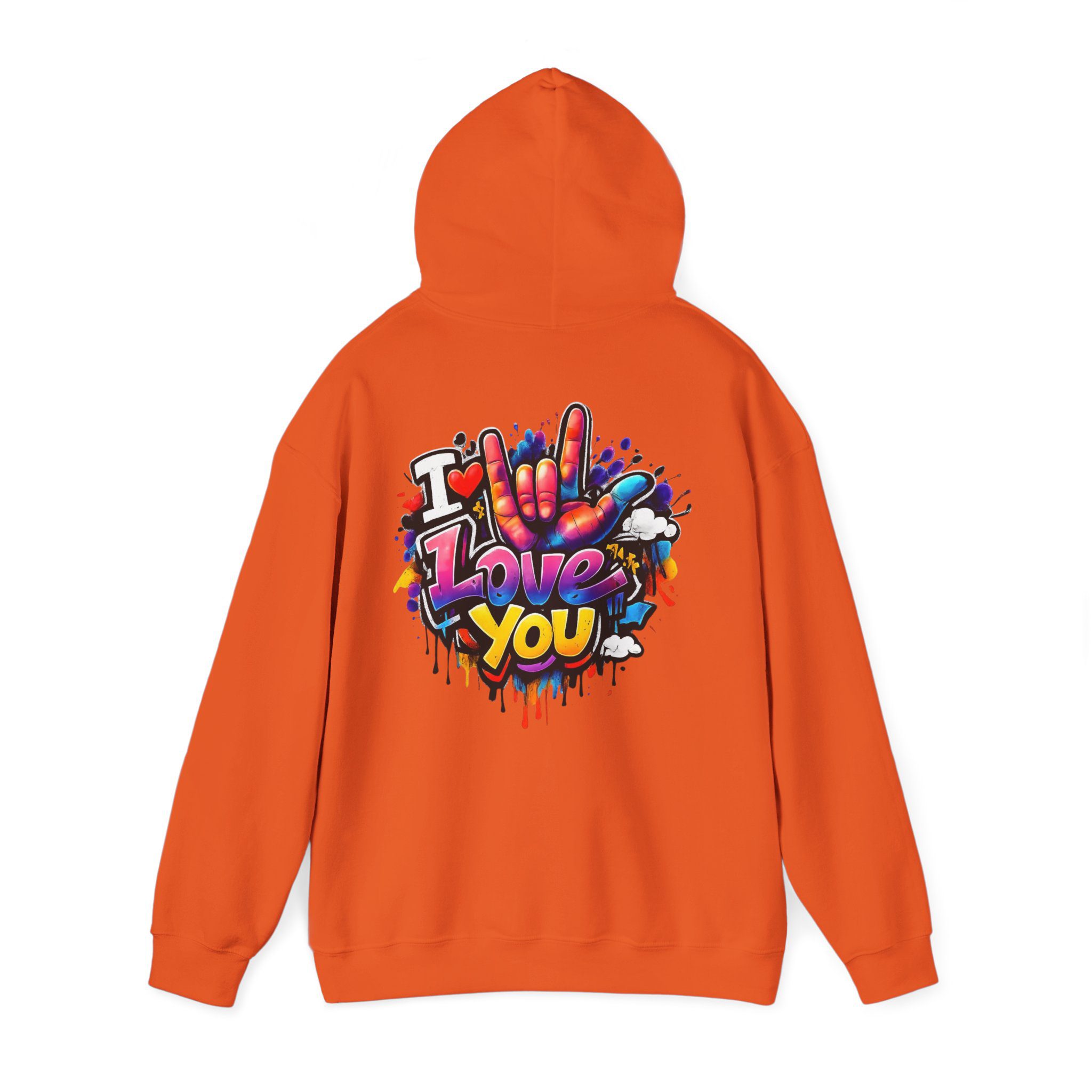 Wärme zum Anziehen – kombiniert mit einem Hauch von Street-Art. Dieses mittelschwere Kapuzen-Sweatshirt verbindet ein weiches, langlebiges Material mit ausdrucksstarker Graffiti-Kunst: einem kleinen Brustmotiv und einem großen Rückendesign mit dem Schriftzug „I Love You“ in verspielten Farben und tropfenden Farbeffekten. Der Hoodie fühlt sich an wie eine Umarmung – angenehm weich auf der Haut, locker geschnitten und gemacht für viele Trage- und Waschgänge. Die doppellagige Kapuze mit farblich abgestimmter Kordel sorgt für einen hochwertigen Look, während die Kängurutasche die Hände warm hält. Für alle, die Liebe gerne laut, bunt und sichtbar ausdrücken, wird dieser Hoodie zu tragbarer Kunst.