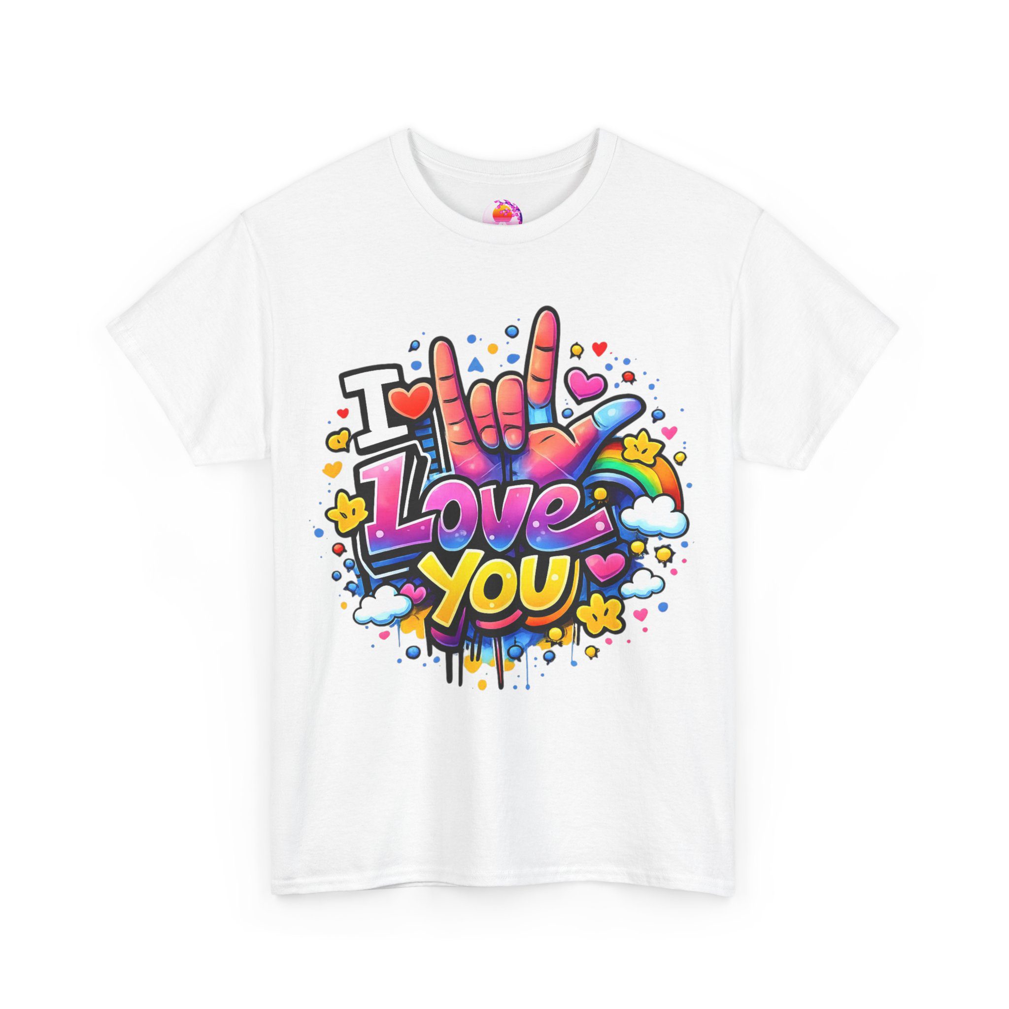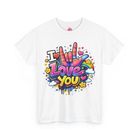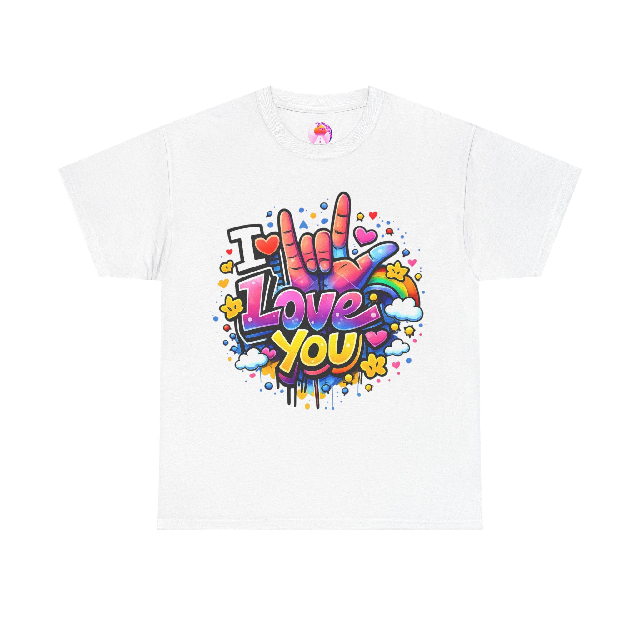Ein fröhliches, farbenstarkes T-Shirt: Dieses weiche, atmungsaktive Baumwollshirt trägt ein poppiges Graffiti-Herzmotiv auf der Brust – eine bunte Hand, die „I love you“ in Gebärdensprache zeigt, umgeben von Herzen, Sternen und farbigen Spritzern. Ein Design, das sofort ins Auge fällt und gute Laune transportiert.