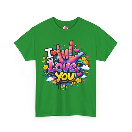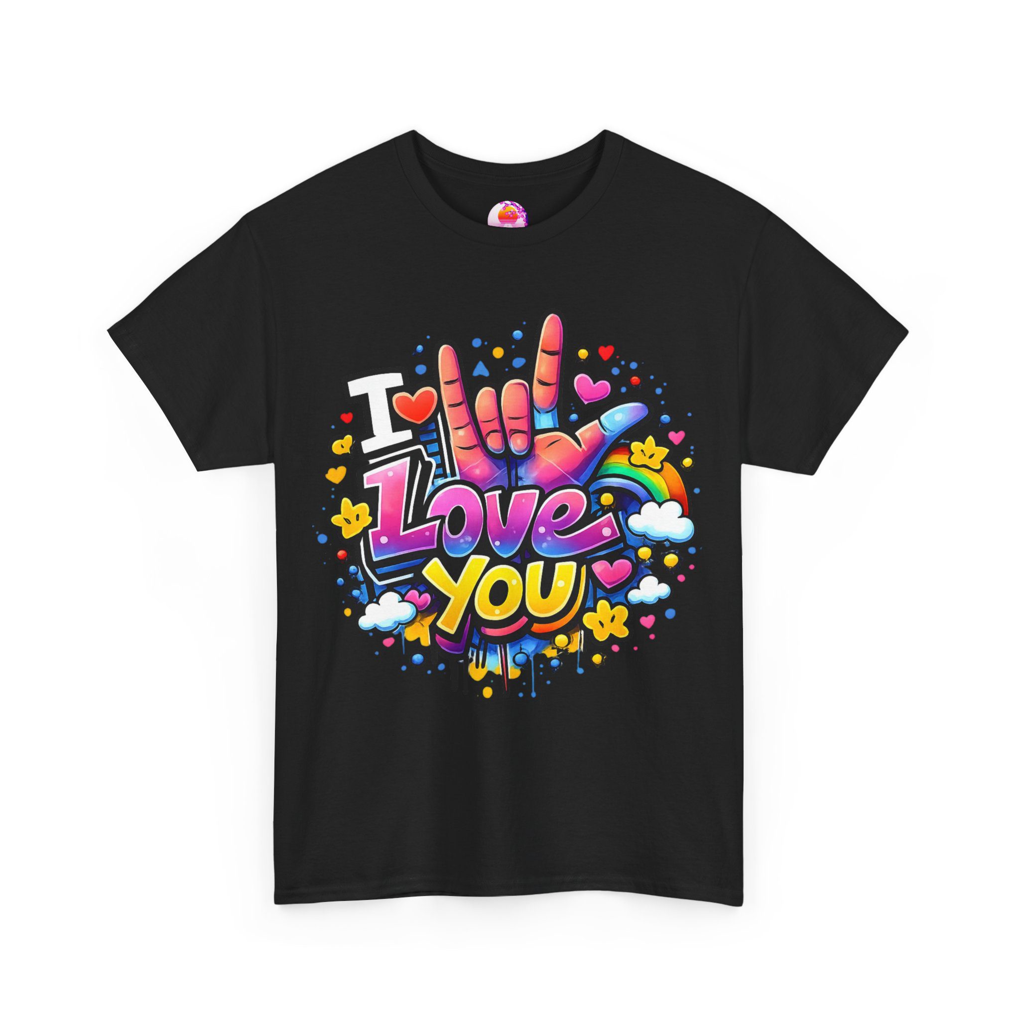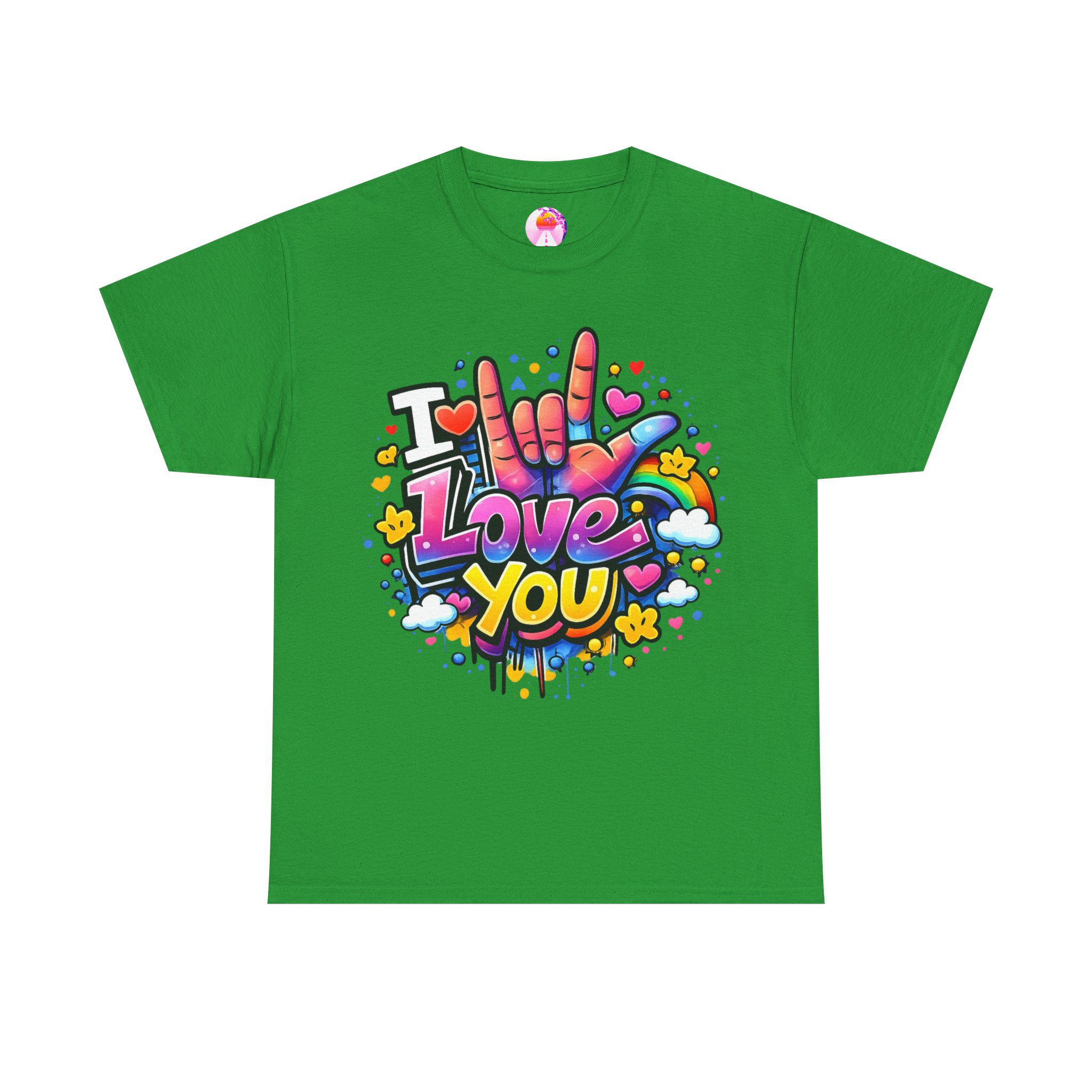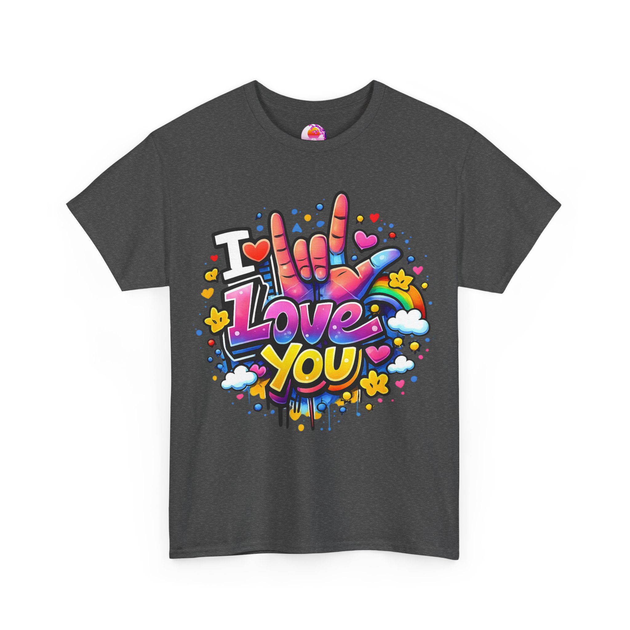 Ein fröhliches, farbenstarkes T-Shirt: Dieses weiche, atmungsaktive Baumwollshirt trägt ein poppiges Graffiti-Herzmotiv auf der Brust – eine bunte Hand, die „I love you“ in Gebärdensprache zeigt, umgeben von Herzen, Sternen und farbigen Spritzern. Ein Design, das sofort ins Auge fällt und gute Laune transportiert.